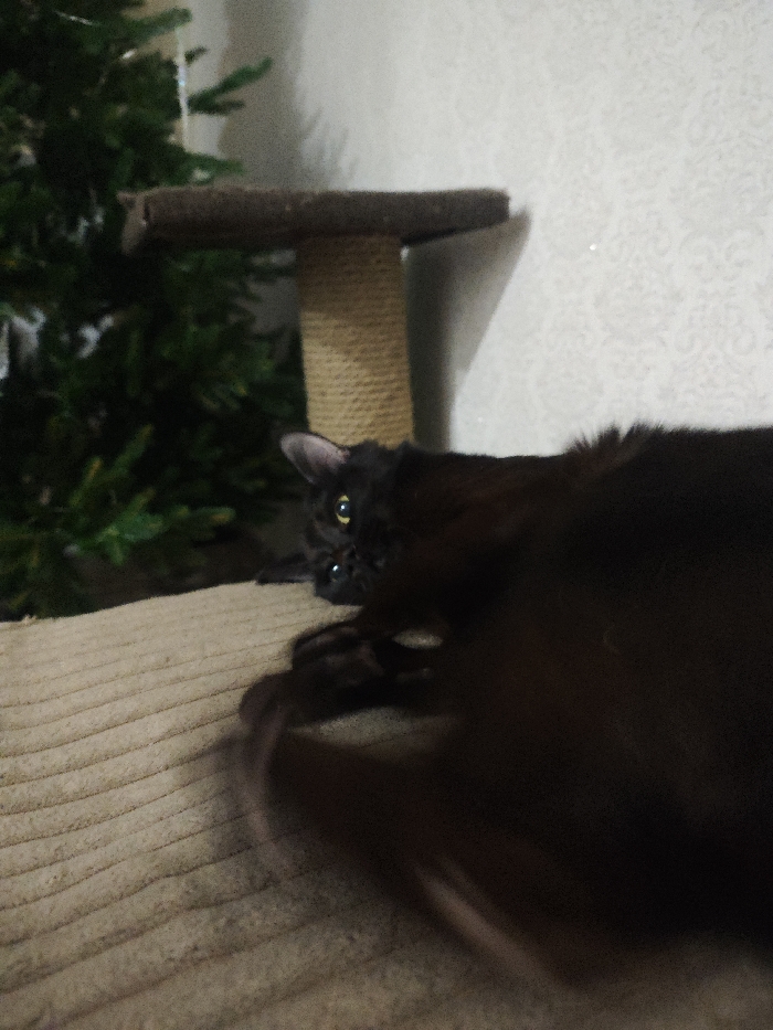 A dark brown cat with yellow eyes lies on a tan, corrugated surface. The cat’s tail is slightly blurred, indicating movement. Behind the cat, a scratching post with a sisal rope-covered pole and a carpeted platform are partially visible. A blurry green Christmas tree stands to the left. The background is a white wall with a subtle patterned texture.
