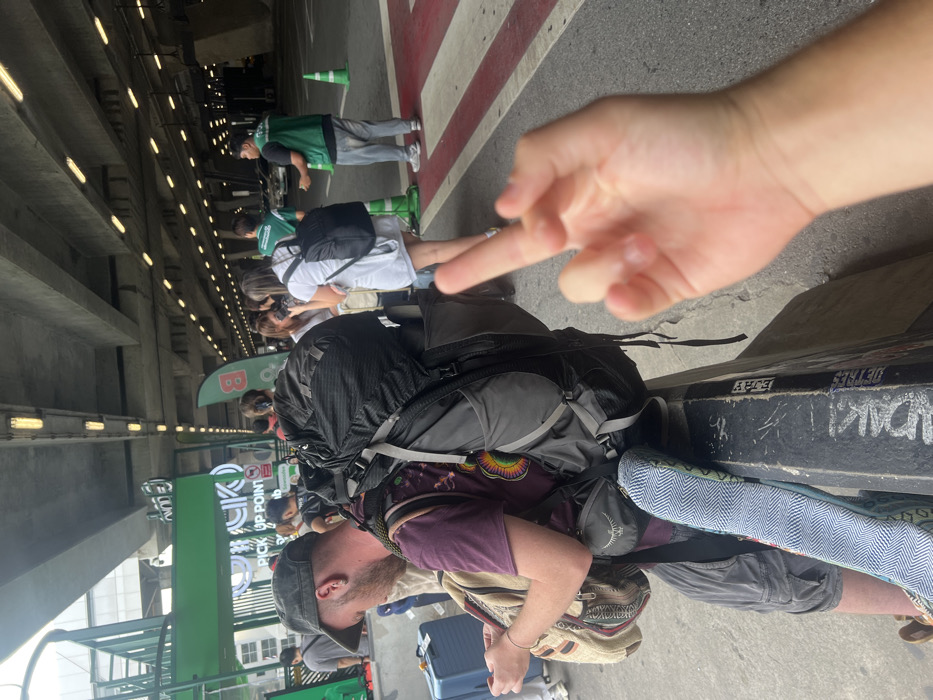 The image depicts a transportation pick-up point situated beneath a concrete elevated structure in Nong Prue Subdistrict, Thailand. In the immediate foreground, a blurred human right hand is visible, extending from the lower right corner, with skin blemishes on its palm and a partially raised index finger. To the mid-left, a Caucasian male with a beard, wearing a dark cap, a dark purple t-shirt, and cargo shorts, is seated on a black concrete barrier. He is equipped with a large grey and black hiking backpack, an "Osprey" logo visible on a smaller pouch, and another smaller, light-colored woven bag resting near his lap. He is observing a smartphone in his hands. A blue rolling suitcase is positioned to his left, and his left foot, adorned with a patterned shoe, rests on the barrier. In the mid-ground, a group of people stands near a prominent green sign displaying "PICK UP POINT" in both English and Thai script. Among them, a woman wearing a white dress and a black backpack is visible. Further right, two men in green vests, indicative of staff, are present; one faces right, appearing to engage with individuals, while the other faces towards the camera. The background features a paved roadway with distinctive red and white striped ground markings and two orange traffic cones. The overhead concrete structure is equipped with multiple linear fluorescent light fixtures. Vehicles are partially visible in the distance on the roadway.