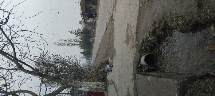 The image depicts a rural or semi-urban street scene in Fayziabad, Uzbekistan, under an overcast sky, suggesting late autumn or winter. In the immediate foreground, a concrete-lined channel containing flowing water runs horizontally across the frame, with a gray concrete pipe discharging water into it from the left bank. Sparse green vegetation and bare earth line the channel. On the left side of the midground, a large deciduous tree with numerous bare, dark branches dominates, its light-colored trunk rooted near a concrete surface. Behind this tree, a portion of a light-colored building is visible, alongside a red cylindrical object resembling a mailbox or utility box. The central and right portions of the midground are occupied by an unpaved or poorly maintained asphalt road, characterized by dirt patches and uneven surfaces, extending into the hazy distance. Along the right side of this road, a line of evergreen trees and tall, slender deciduous trees with bare branches are present. Further down the road, on the right, several low-rise, rustic-appearing buildings with dark roofs and walls are visible. A single individual, dressed in dark clothing, is observed riding a bicycle away from the viewer on the right side of the road. The background consists of a hazy, overcast sky, obscuring any distant horizon.