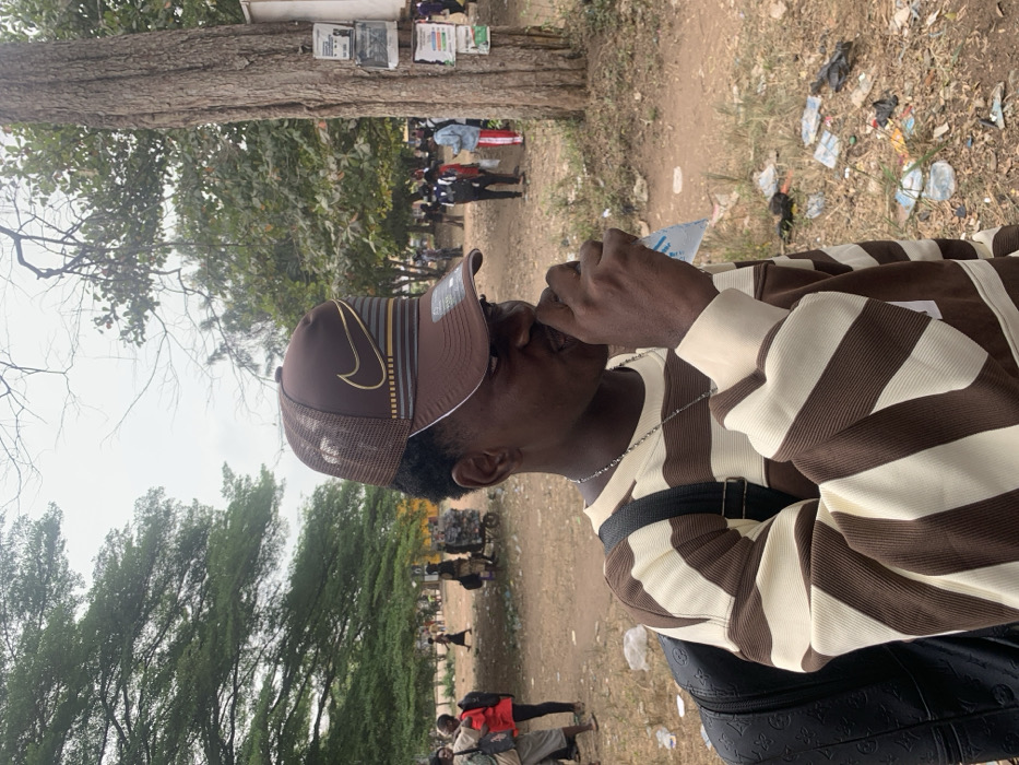 The image depicts an outdoor, unpaved public area in Ihiagwa, Nigeria, under an overcast sky. In the foreground, a male individual is seen in profile, facing right, drinking from a clear plastic sachet held to his mouth with his right hand. He wears a brown mesh-back baseball cap featuring a gold Nike swoosh and horizontal gold and grey stripes, a brown and cream-striped long-sleeved shirt, and a thin silver-colored necklace. A black backpack is visible on his left shoulder. The ground around him, particularly to his right, is dirt and contains scattered litter including plastic bottles and wrappers. In the mid-ground and background, a diverse group of individuals is dispersed across the unpaved area, some walking and others standing. A cart loaded with items is visible in the mid-left background. Several large trees with green foliage are present, and a prominent tree trunk on the right side of the frame has multiple papers or notices affixed to it.