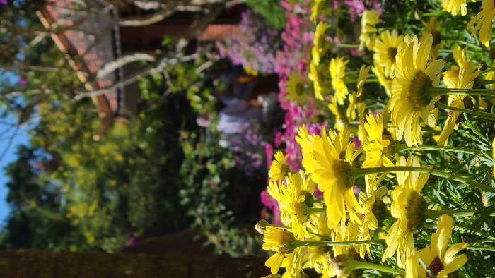 Vibrant yellow daisy-like flowers dominate the right side of the frame, their stems rising towards the top. Behind them, a blurred background reveals a mix of pink and purple blossoms, interspersed with green foliage. To the left, a building with a brown roof is partially visible, obscured by trees and greenery. The sky peeks through the leaves, a pale blue. The image appears to be taken at ground level, focusing on the floral display.