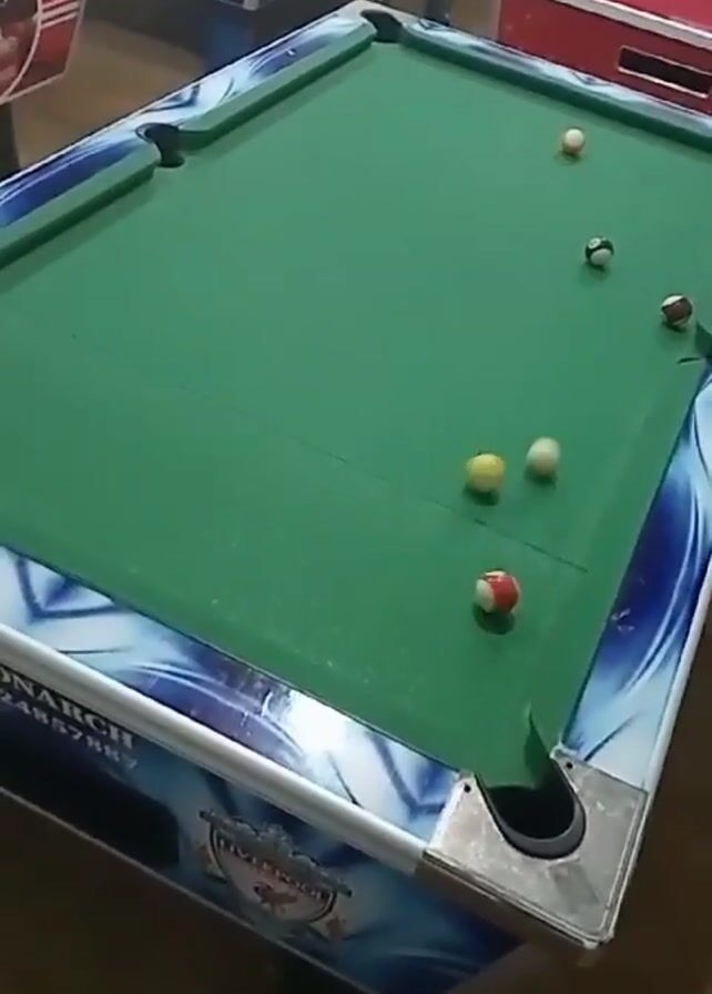 Several people are playing pool in a room with three pool tables, each a different color: blue, green and white, and red. The video focuses on the green and white pool table, where several pool balls are scattered. A person wearing a black jacket and pants, with "2019" printed on the back of their jacket, approaches the table with a pool cue. They stand near the table as if preparing to take a shot. The environment suggests a recreational space.