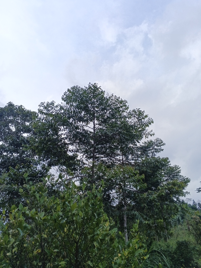 The image displays a natural landscape under an overcast sky. The upper portion shows a light grey, cloudy sky. The lower two-thirds of the frame are filled with dense green vegetation. In the foreground, a mass of vibrant green foliage from shrubs or young trees with numerous small leaves is prominent. Behind this, several taller trees rise, characterized by darker green, full canopies and visible slender trunks. No individuals, animals, or artificial structures are present. The scene represents a heavily vegetated, possibly forested or hilly environment. The precise location within the city of Đà Nẵng, Vietnam, is not discernible from the image.