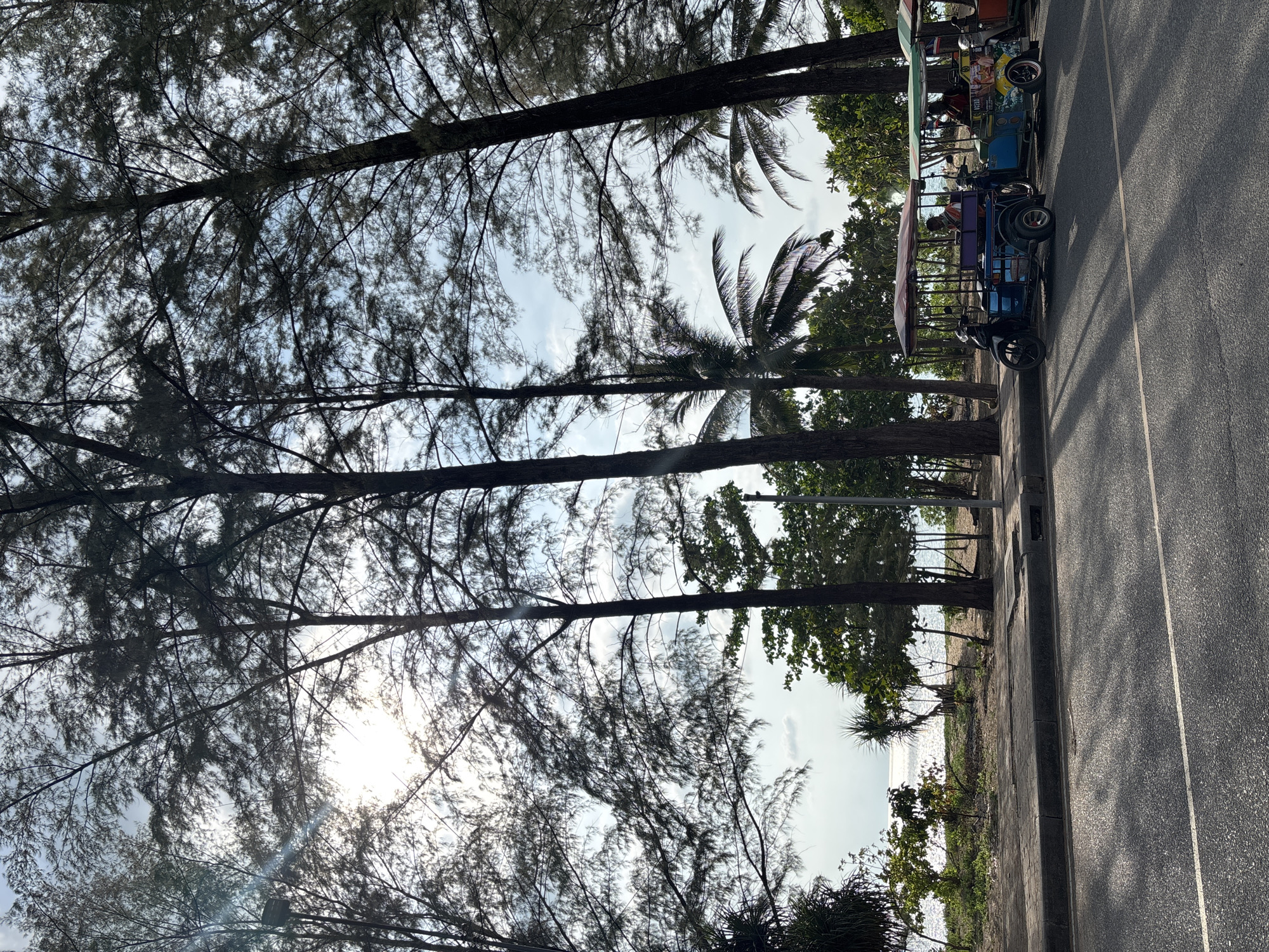 The image depicts a scene in Tambon Mai Khao, Thailand. The foreground features tall trees with dense foliage, obscuring the sky and sunlight. A glimpse of the beach and ocean is visible through the trees. Adjacent to the road, several three-wheeled vehicles are parked. The image is taken from a low angle, emphasizing the height of the trees and the composition. The overall environment suggests a coastal area with a road running alongside the beach.