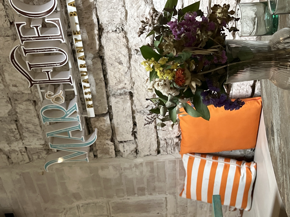 brick wall with a sign that reads "Mar y Fue Restaurant Bar". To the right, a vase filled with flowers sits on a wooden surface, accompanied by two pillows: one solid orange and the other striped orange and white. A chair can be seen behind the pillows. The scene gives off a rustic, charming vibe.