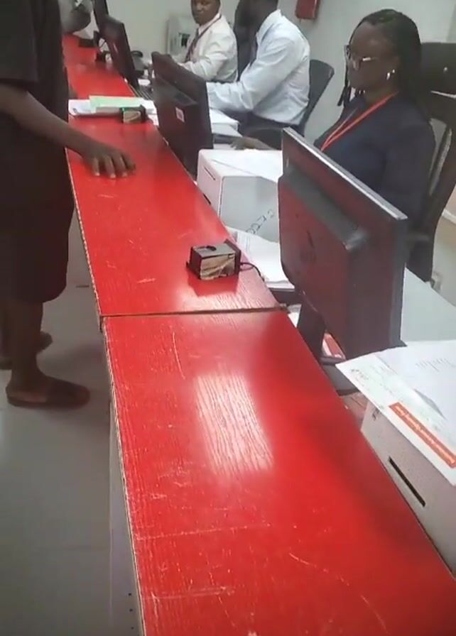 customer service counter inside an office or bank. The counter is long and red, with white panels on the lower part. Several people are standing in line, waiting to be served. Three employees are visible behind the counter, each at their own workstation with a computer. The first employee is a woman with glasses and a dark jacket. The second employee is a man in a white shirt and tie. The third employee is a woman with her hair pulled back and a white shirt. There are various items on the counter including a stamp, receipts, and papers. The floor is tiled. A water dispenser can be seen in the background. The person filming is standing in line, showing their own hand at the edge of the frame.