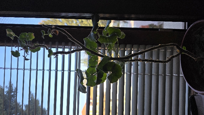 The scene depicts a potted plant situated indoors, positioned directly in front of a window in the city of Belitsa, Bulgaria. The primary subject is a single plant, identified as a *Pelargonium* (geranium), characterized by its slender, woody stems and sparse arrangement of lobed, green leaves. The plant is contained within a dark brown, cylindrical pot with a slightly flared rim, resting on an unseen surface. Behind the plant, the window is fitted with horizontal Venetian blinds, which are partially open, allowing light to filter into the room in horizontal bands. The window frame is dark brown. Through the gaps in the blinds, a clear blue sky is visible in the background. On the left side, the silhouette of coniferous trees can be discerned against the sky. On the right, beyond the window frame, a distant structure with a light-colored wall and a reddish-orange roof is faintly visible. The scene is backlit, with outdoor daylight illuminating the edges of the plant's leaves and creating a contrast with the darker interior elements. No individuals, actions, or interactions are present in the image.