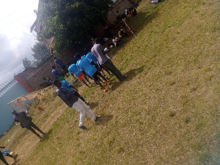 The image displays an outdoor scene within Karingani ward, Kenya, on a grassy field under an overcast sky. The perspective is tilted approximately 30 degrees to the right and slightly elevated. In the mid-ground, a group of approximately seven persons, primarily young males, is clustered. At least five are wearing light blue shirts or jerseys, with two distinctively wearing bright orange shorts, suggesting uniform attire. They are standing upright, facing generally towards the left side of the frame. One individual in a dark jacket and light pants stands in the immediate foreground, slightly separated from this group. To the left, a soccer goal structure with a dark, possibly folded or damaged net is partially visible on the dry, yellowish-green grass. A white soccer ball rests on the ground in the lower-left foreground. Another person in dark attire stands near the goal. The background on the left features a tall, blue wall topped with a security fence, behind which a building with a reddish-brown facade is partially visible. On the right side of the background, a large, dense green tree partially obscures a structure. Beneath this tree, approximately ten additional individuals are seated or squatting along what appears to be a low wall or embankment. The scene depicts a gathering, likely associated with a soccer activity.