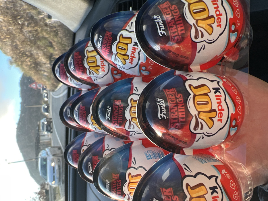 - "The image displays approximately fifteen "Funko Stranger Things" themed Kinder Joy eggs, arranged in clear plastic packaging" by FM-T5Wdg1, licensed under CC BY 4.0