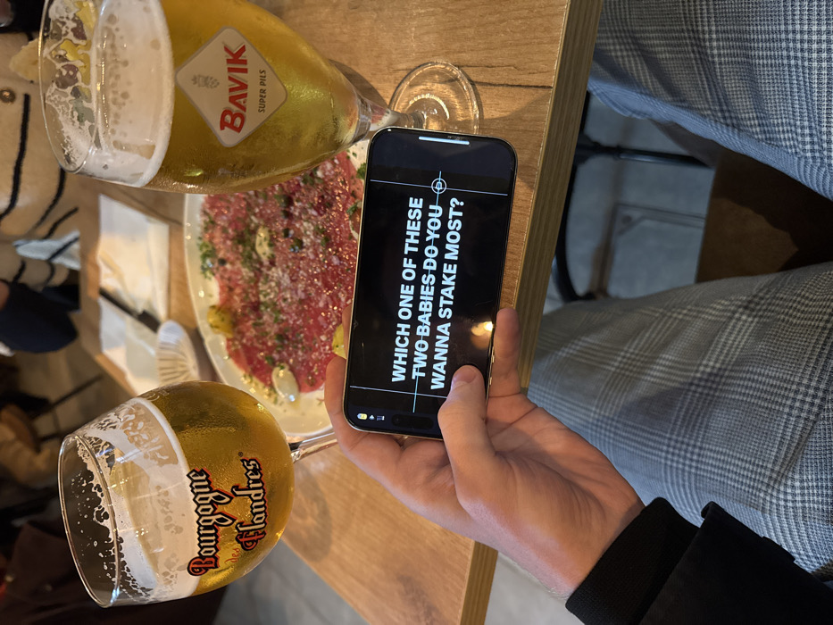 The image displays an indoor scene at a restaurant or bar in Bruges, Belgium. A person's left hand, wearing a dark sleeve, holds a black smartphone horizontally, centered in the frame. The phone's screen shows white text on a black background: "WHICH ONE OF THESE TWO BABIES DO YOU WANNA STAKE MOST?". The person's lap, covered by gray checkered trousers, is visible below the phone. On a light wooden table surface, two beer glasses and a plate of food are present. To the left, a stemmed chalice-style glass branded "Bourgogne des Flandres" contains a golden amber beer with a white head. To the right, a cylindrical pint glass branded "BAVIK SUPER PILS" also holds golden amber beer with a white head. Between these glasses, a white circular plate holds a dish of thinly sliced red meat, garnished with green herbs, grated white cheese, and yellow accents, consistent with beef carpaccio. The background is blurred, showing indistinct shapes of other patrons and restaurant elements.