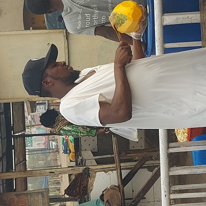 A person in a white t-shirt and black cap stands near a vendor preparing a coconut. The vendor wears gloves and a grey shirt. In the background, a woman in a green patterned shirt and an election poster are visible. The scene appears to be an outdoor market or street food area. The perspective is from a slightly low angle.