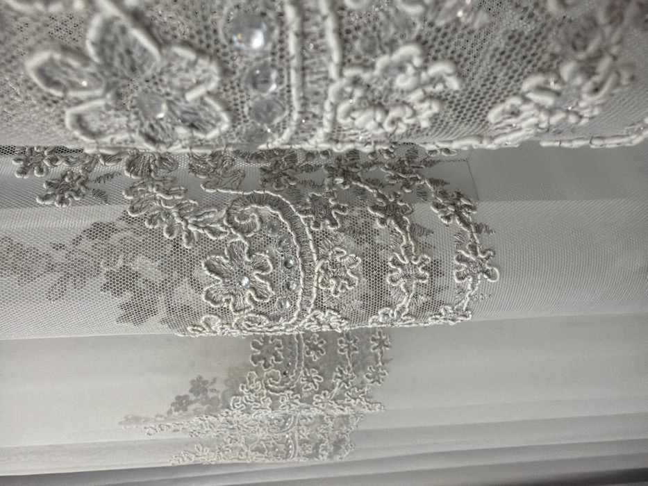 Delicate, silver lace with floral and paisley motifs overlays a sheer, light grey or white fabric. Embellishments, possibly small beads or sequins, are scattered within the lace design. The material is layered or folded, creating depth and dimension. The background is indistinct, allowing focus on the intricate textile details. The lighting is soft and diffused, enhancing the delicate nature of the fabric.