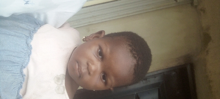 A close-up vertical portrait depicts a young child with dark skin and short, dark, curly hair, looking directly at the camera with a neutral expression