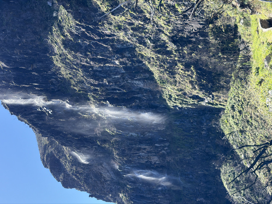 A rugged cliff face dominates the image, speckled with patches of green moss and sparse vegetation. Wisps of cascading water create ephemeral waterfalls down the dark, uneven rock surface. A vibrant blue sky peeks out from the bottom left corner. The scene evokes a sense of natural beauty and the powerful forces of nature.