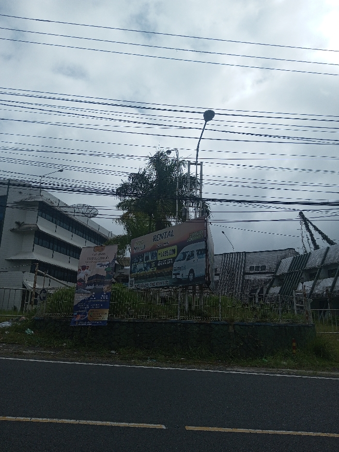 An outdoor scene shows a roadside view. A billboard advertises 'Rental' services with a picture of a van. A smaller banner displays travel destinations. Behind the billboard, there's a building with multiple windows, topped with a satellite dish. A palm tree is visible beside the billboard. Utility lines stretch across the sky above everything. A street lamp stands tall near the billboard. The foreground is a road with white lines.