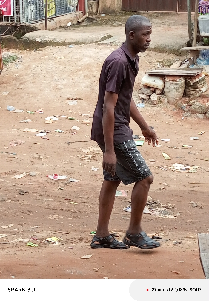 - "The image displays an adult male in motion, walking from left to right across an unpaved, reddish-brown dirt path in the city of Onitsha, Nigeria" by FM-1O94j1, licensed under CC BY 4.0