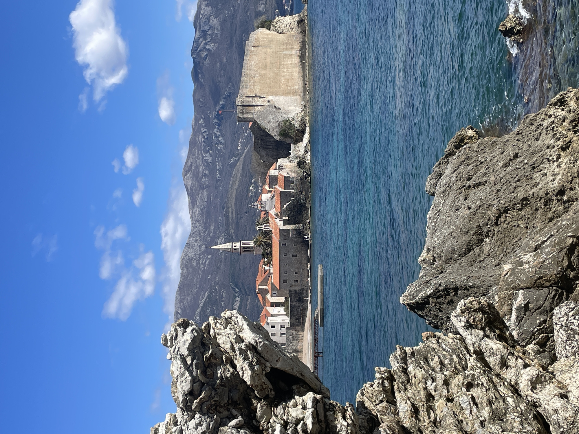The image depicts a panoramic coastal view of Budva Old Town in Budva, Montenegro, under a clear blue sky. In the foreground, large, jagged, light-grey and dark-grey rock formations occupy the left and lower-right, partially submerged in the clear, blue-green sea. The water surface exhibits minor ripples. The midground features Budva Old Town, situated on a peninsula extending into the sea. The town comprises numerous stone buildings with terracotta-tiled roofs and light-colored facades. A prominent church tower with a pointed spire is centrally visible within the town. To the right, a substantial stone fortress or citadel with high walls juts into the sea, displaying a red flag atop its battlements. On the left side of the town's waterfront, a small sandy beach is present, along with a concrete pier structure connected to a red metal support. Several indistinct human figures are discernible on the waterfront near the beach and the fortress. The background consists of a range of dark, rugged mountains stretching across the horizon. The sky is a vibrant blue with scattered white cumulus clouds. The scene is illuminated by bright daylight.