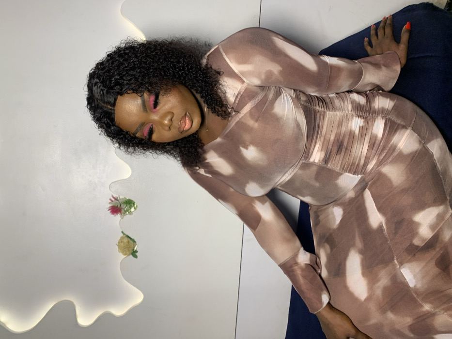 A woman with dark, curly hair and pink eyeshadow poses in a tan and white dress. The dress features long sleeves and a fitted bodice with gathered detailing. She leans against a white wall with a decorative edge, adorned with small floral arrangements. Part of a dark blue surface is visible in the background, likely a piece of furniture. Her nails are painted in a bright orange-red hue.