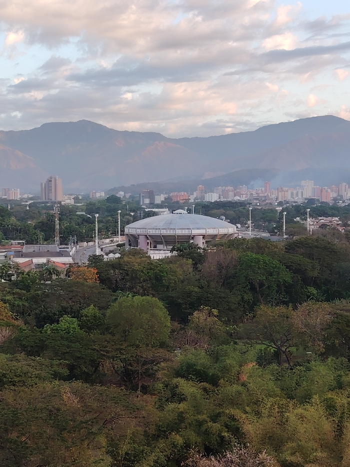 An elevated, distant view depicts the city of Valencia, Venezuela, under a partly cloudy sky. The foreground comprises a dense, undulating expanse of green foliage, dominated by various trees and shrubs, some exhibiting darker greens and others lighter or with hints of yellow/orange. In the midground, the prominent structure is the Fórum de Valencia, a large, circular, domed arena with a light gray, possibly corrugated, roof and a pinkish-beige lower section supported by columns. It is surrounded by asphalt roads and pathways, with multiple tall, white light poles uniformly spaced around its perimeter. Adjacent to the arena are smaller, utilitarian buildings and additional clusters of trees. The background reveals an urban panorama of Valencia, characterized by a mix of low-rise and multi-story residential and commercial buildings. A distant, hazy mountain range, part of the Cordillera de la Costa Central, forms the horizon under the cloud-streaked sky, which shows faint pink and orange tones suggestive of early morning or late afternoon light. No individuals or discernible activities are present.