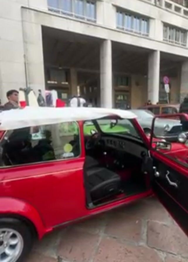 red Mini Cooper convertible parked on a brick surface. The car has its driver-side door open, revealing a black interior. A white convertible top is folded back. In the background, there is a tall building with multiple windows and a large archway leading to a street. Other cars are parked nearby. A person walks past in the background. The video has a soundtrack with music.