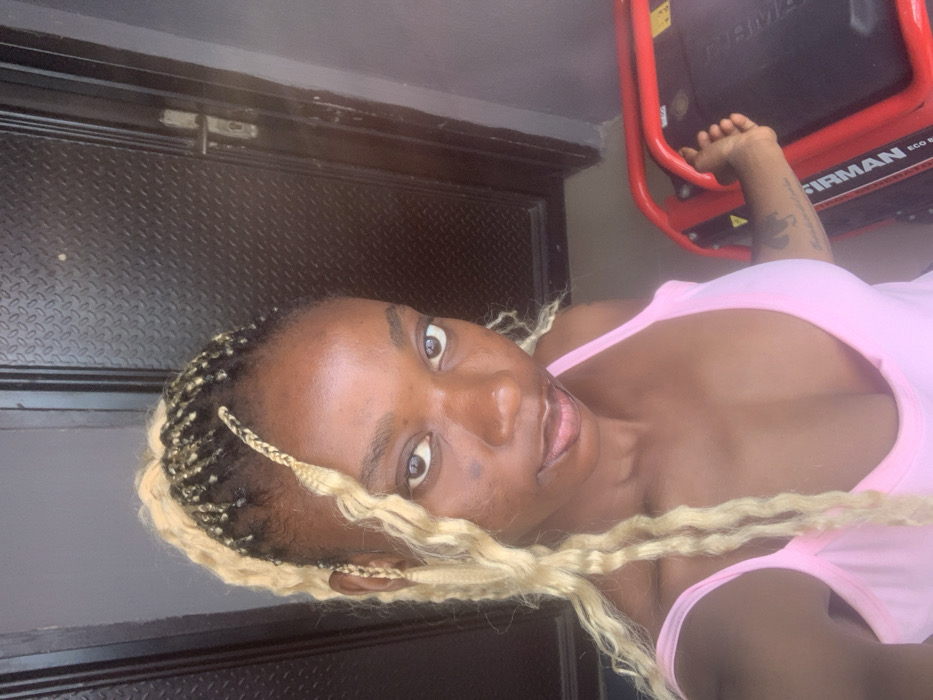 A female individual is depicted in a selfie-style photograph taken in what appears to be an outdoor or semi-outdoor location