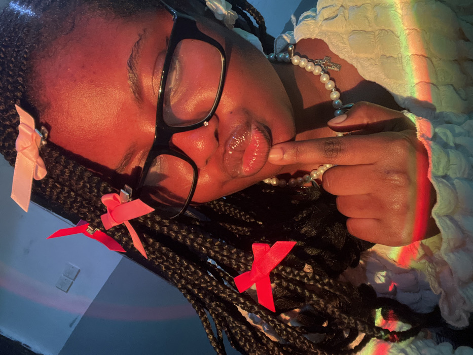 A person with braided hair adorned with ribbons, wearing glasses and a pearl necklace with a cross pendant, is seen from a tilted perspective