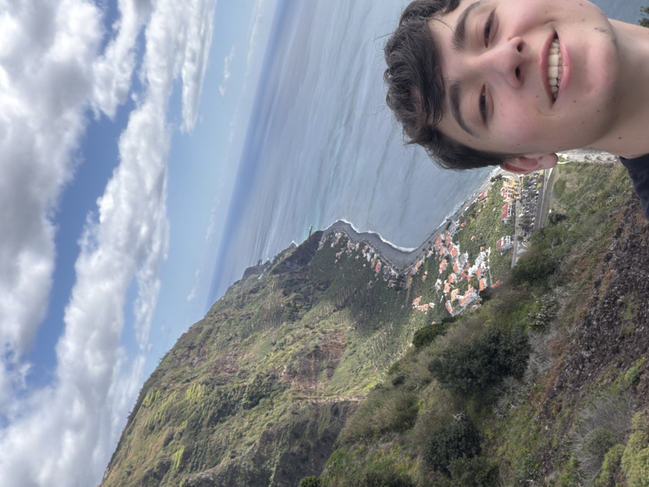 A male individual is captured in a close-up selfie in the foreground, smiling slightly, with dark hair visible. The perspective places the viewer high above a coastal landscape, overlooking the village of Jardim do Mar, located within the municipality of Calheta, Portugal. The left side of the image features a steep, verdant cliff face covered in dense vegetation and exhibiting extensive agricultural terracing. This cliff descends towards a coastal plain where numerous buildings with orange-tiled roofs are clustered along a dark-colored beach. A road runs parallel to the coastline through the village. To the right of the cliff and village, the Atlantic Ocean extends towards the horizon, showing varying shades of blue with visible wave patterns near the shore. The sky above is partly cloudy, featuring patches of clear blue interspersed with white cumulus clouds.