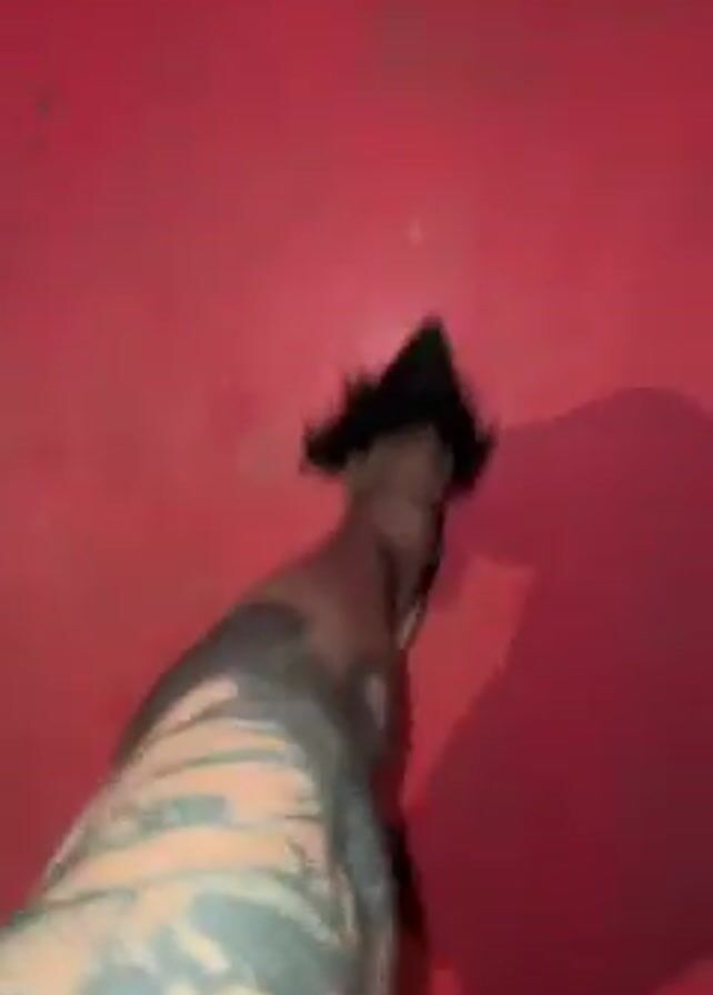 A woman is shown walking on a red surface wearing black heels with a feathered accent and leg tattoos. She is wearing a black top and pink tinted glasses. She is outside at night with lights in the background. She briefly shifts the camera view to reveal another pair of feet on the same red surface, this time wearing brown sandals.