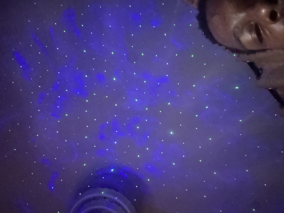 The scene depicts an indoor environment in Oron, Nigeria. The ceiling or a wall surface is illuminated by a projector, displaying numerous green light points against a deep blue, diffuse background, simulating a 'starry night' effect. In the upper left quadrant, a portion of a white, circular device with concentric rings, consistent with a light projector or ceiling fixture, is visible. In the lower right quadrant, the upper portion of an individual's head and face is present. This individual has dark skin and dark hair styled in short dreadlocks or braids, with their forehead, eyebrows, partially closed eyes, and upper nose visible. A dark, elongated object, possibly a mobile phone, is held near the individual's right temple area.