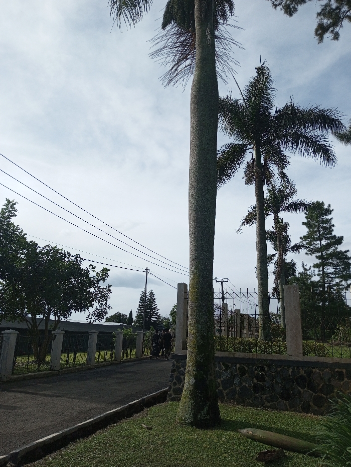 This image depicts an outdoor scene in Salai Har Htan, Myanmar, under a partly cloudy sky. In the foreground on the right, a grass area contains a fallen log segment and the lower trunk of a tall palm tree. Immediately behind this palm tree, a low wall constructed of dark, irregularly shaped stones supports a black metal fence. An asphalt path with a concrete curb on its left edge extends from the foreground and curves to the left into the midground. On the left side of the path, a fence with white concrete posts and black railings borders an area with green leafy trees and a visible building structure with a dark roofline. A utility pole with three dark electrical wires extending horizontally is situated on the left side of the scene. Several indistinct human figures are visible standing on the asphalt path in the mid-distance on the left. In the midground and background, a line of tall palm trees extends toward the right, interspersed with coniferous trees. A black metal fence with diagonal criss-cross patterns is visible behind the stone wall and between the palm trees.