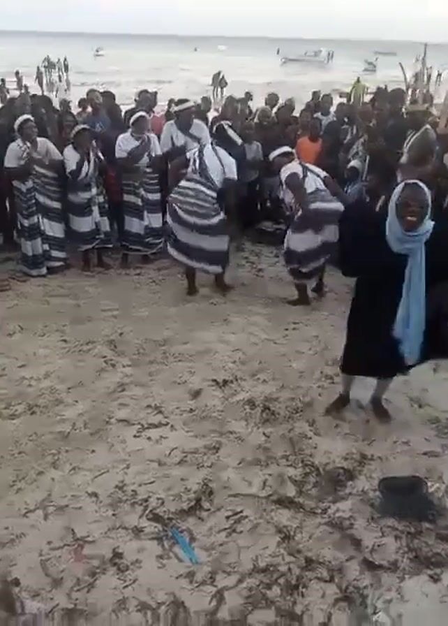A crowd of people is gathered on a beach, focused on a group of dancers. The dancers are wearing striped white and black outfits, and some have headbands. They are performing a dance with synchronized movements, including stomping and bending. The crowd surrounds them, with some people clapping and cheering. In the foreground, a woman in a black burka and a light blue headscarf is also dancing. The beach has light-colored sand, and the ocean is visible in the background with several boats. The scene appears to be a cultural celebration or performance.