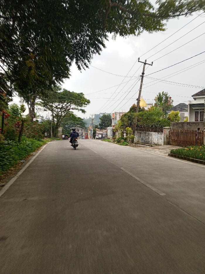 The image depicts a two-lane asphalt road in Kheda, India, extending into the distance under an overcast sky. A lone individual, dressed in dark attire, operates a dark motorcycle, traveling away from the viewer in the center of the road. On the left side, dense green foliage, including large trees and shrubs, forms a continuous line along the roadside. On the right side of the road, a concrete curb is present, with small yellow flowers growing near it in the foreground. Beyond the curb, a low wall and a brown slatted fence precede a light-colored residential building with a dark gray gabled roof. Further along this side, a wooden utility pole supports multiple overhead power lines. A white building featuring a golden dome-like structure is partially visible above the treeline in the mid-ground. Additional structures are discernible further down the road, interspersed with vegetation. The background reveals distant, green, undulating hills. The sky is uniformly light gray and overcast. No other moving vehicles or pedestrians are observed in the scene.