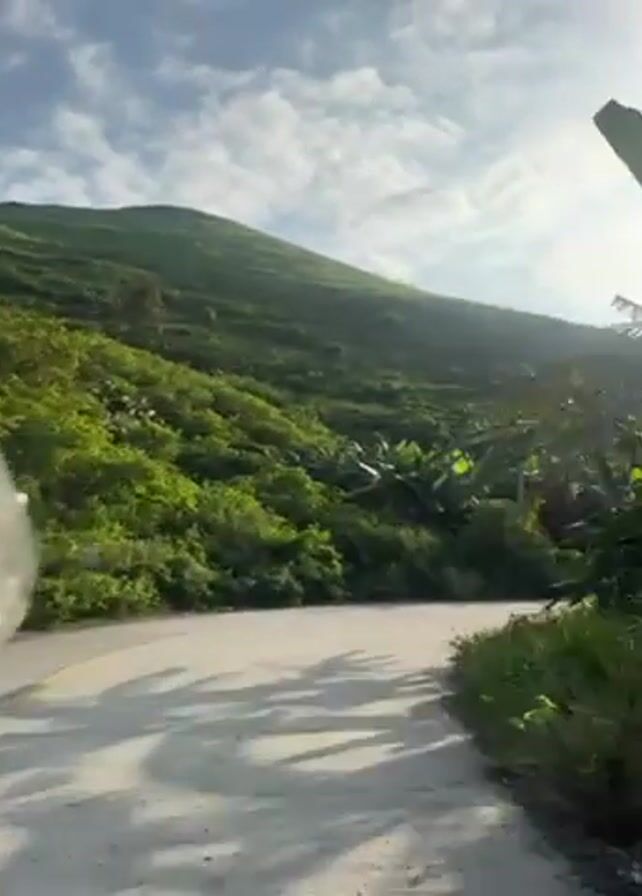A winding asphalt road ascends a steep hillside covered in lush green vegetation. The sun shines brightly, partially obscured by scattered clouds in the sky. Palm trees are visible along the side of the road, casting shadows. The perspective suggests the video was taken from a moving vehicle.