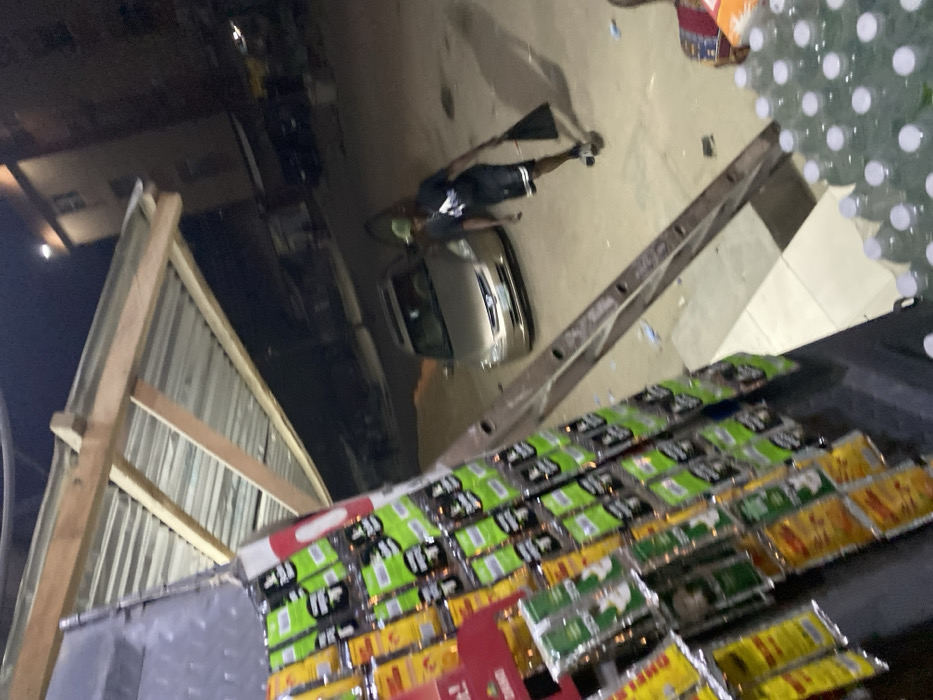 A night scene depicts a truck bed loaded with stacks of packaged goods in green, yellow, and red wrappers. Bottled water cases are adjacent to a leaning ladder. A person with a paddle stands near a silver car on the street, illuminated by streetlights. A corrugated metal structure with wooden supports is on the left. The photo is taken from an elevated perspective.