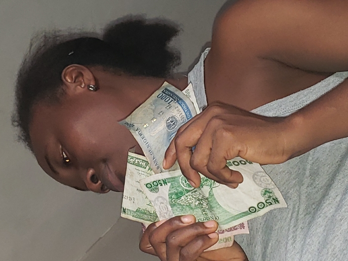In Agunmo, Nigeria, a close-up, upward-angled shot captures an individual of African descent, facing partially right and looking upwards. The subject, wearing a light grey tank top and a silver hoop earring in their visible right ear, holds a quantity of Nigerian Naira banknotes with both hands close to their chest and chin. Visible denominations include ₦500 and ₦1000 notes. The money is crumpled and held loosely. The background is a plain, light grey surface.