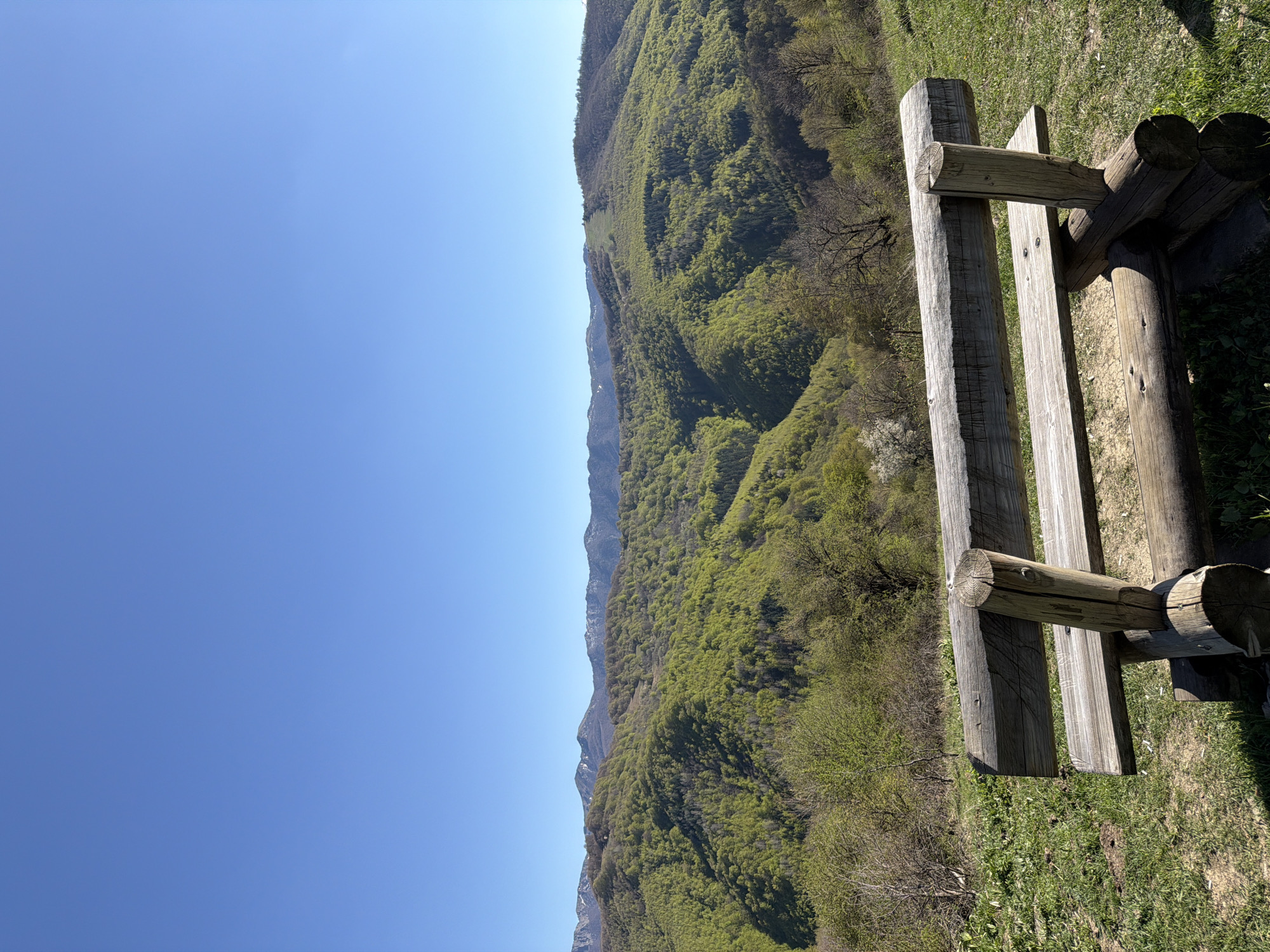 landscape view from what appears to be a mountainous or hilly area. In the foreground, there is a rustic wooden bench. Beyond the bench is a forest-covered mountain range. The sky is clear and blue. The location is possibly near Shipkovo, Bulgaria, given the terrain and environment. No people are visible in the image. The focus is on the landscape and the wooden bench.