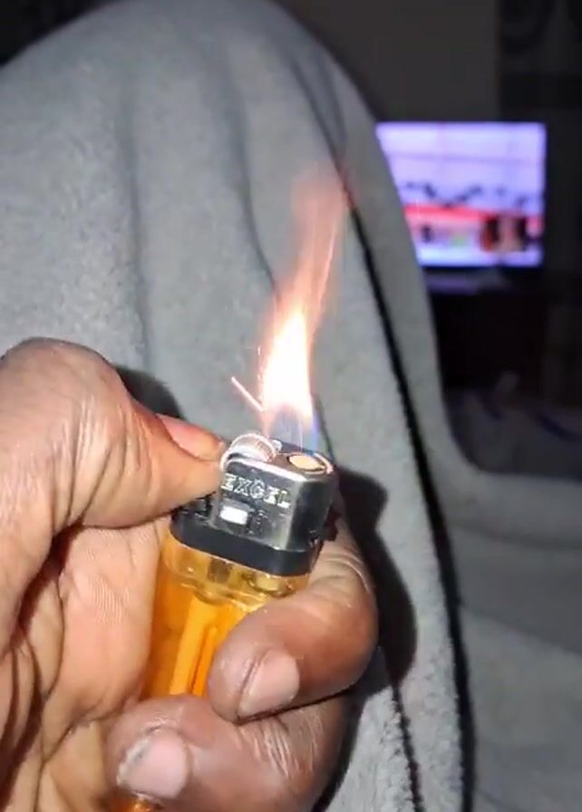 A dark-skinned hand holds an orange "EXCEL" lighter and flicks the spark wheel to ignite the lighter, producing a small flame. The hand is in front of a gray blanket. In the background, out of focus, is a television screen with an indiscernible image on it. The room appears to be dimly lit.
