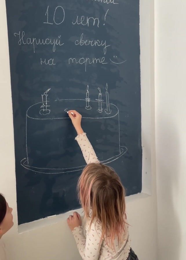 A young girl with pink-streaked blonde hair is drawing a candle on a chalk drawing of a cake on a blackboard mounted on a white wall. The blackboard reads, "School 'Compass', 10 years! Draw a candle on the cake." Another child with dark hair is standing to the left, watching. The chalk drawing depicts a multi-layered cake on a stand, adorned with several candles. The girl is wearing a light-colored long-sleeved shirt and dark jeans. She is focused on her drawing, holding a piece of white chalk in her right hand. The room is well-lit.
