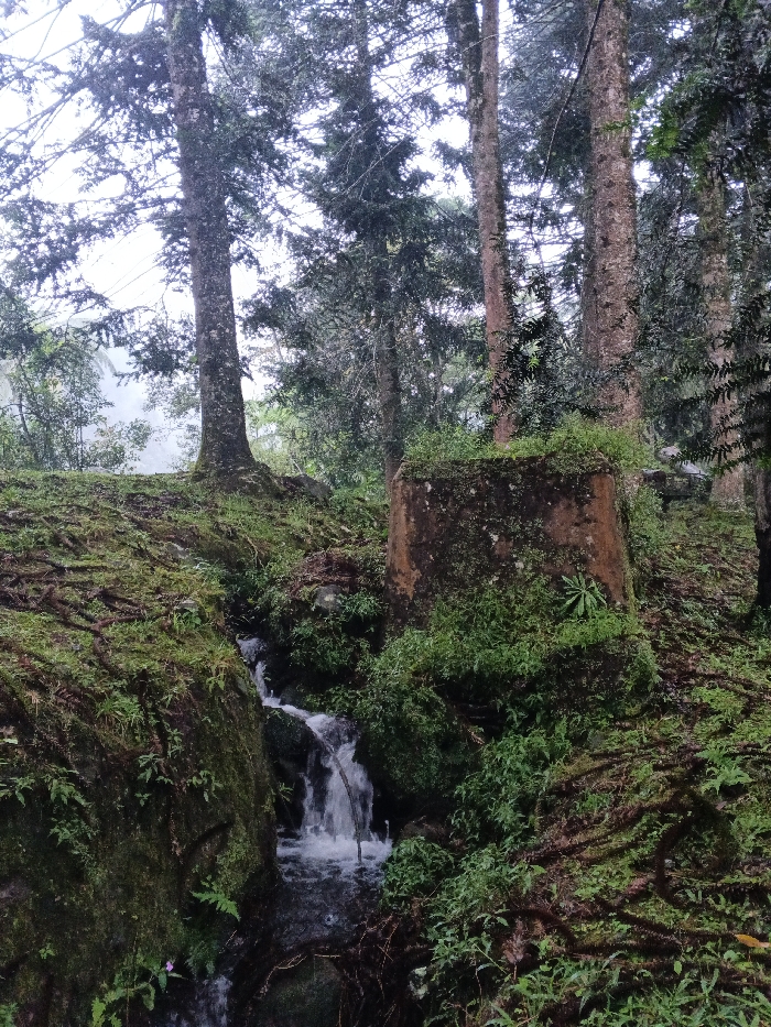 A verdant scene unfolds in a forest setting. A small waterfall cascades over moss-covered rocks into a stream. Lush greenery, including ferns and other plants, abounds on the ground and grows over an old, weathered concrete structure. Tall trees, with moss clinging to their trunks, reach upwards towards a cloudy sky, creating an atmosphere of tranquility and natural beauty.