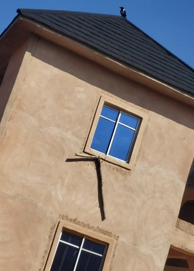 close-up of the exterior of a building with a distinctive architectural style. The walls are a textured, light brown color, and there are square windows with white frames. One window reflects a bright blue sky. A branch-like feature extends from the wall near one of the windows. The roof is covered in dark gray shingles. A magpie is perched on the edge of the roof against the clear blue sky.
