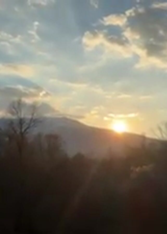 sunset over a landscape of trees and a mountain. The sky is blue with scattered clouds, and the sun is partially obscured by the mountain, creating a bright glow. The trees are mostly bare, and the foreground is dark.