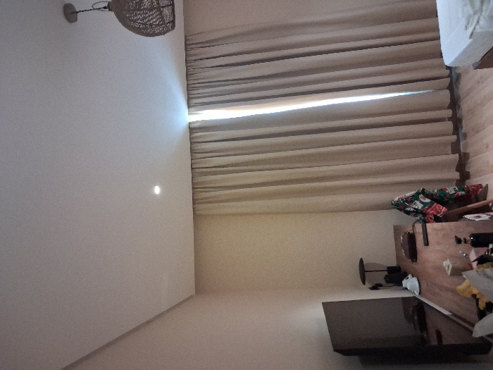 The image displays an interior room, identified as being located in Takum, Nigeria. The room features light beige walls, a flat white ceiling with a single recessed downlight, and a woven spherical pendant light fixture suspended from the ceiling on the right side. The floor is covered with light-toned wooden planks. On the left, a dark flat-screen television is positioned upright on a wooden desk. The desk contains various objects, including two stacked white cups, a black table lamp with a disc-shaped shade, a dark wallet or small bag, a mobile phone or remote control, and multiple small bottles, one featuring a pump dispenser. A multi-colored fabric item with a festive pattern is draped over the front right corner of the desk. The back wall is dominated by a large window covered with light beige, pleated curtains, which are slightly parted in the center, allowing a vertical beam of bright natural light to enter the room. A portion of a white bed with white bedding is visible in the lower right corner of the frame. No individuals are present in the scene.