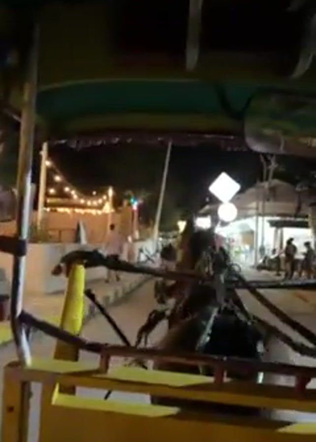 The view from inside a horse-drawn carriage at night shows a bustling street with people walking and riding bikes