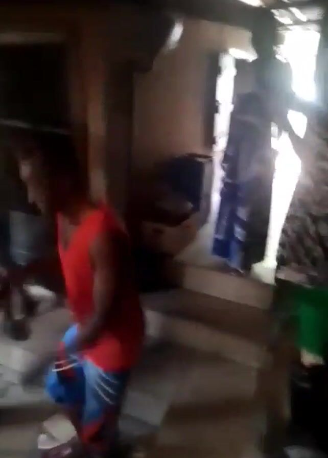 small group of people, adults and at least one child, dancing in what appears to be a courtyard or covered outdoor space. The people are dressed in casual clothes. The lighting is uneven, making some details hard to see. There are some objects such as a red chair, a small table with items on it, and various household items scattered around the edges of the space. The people appear to be enjoying themselves.