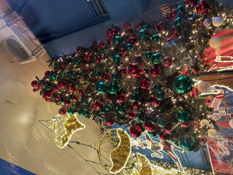 A rotated view showcases Christmas decorations. A dense arrangement of red, green, and white baubles adorns an unseen tree, intermixed with glowing fairy lights. Below, golden wireframe shapes, perhaps stars or ornaments, are illuminated. Hints of a vintage-style Christmas poster are visible, featuring illustrated figures. A blue ceiling with an air conditioning unit is partially captured, anchoring the scene.