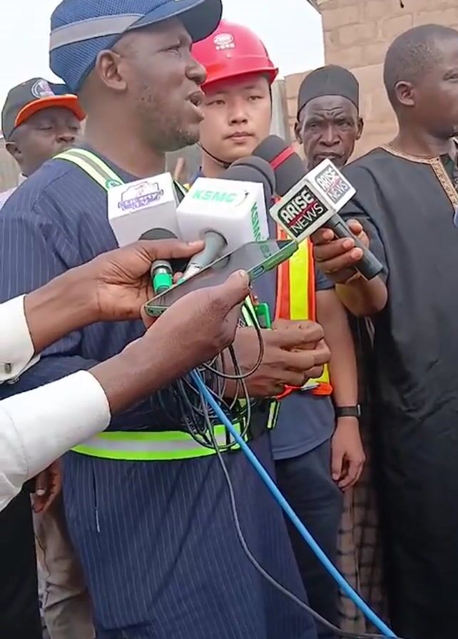 A group of men are gathered around someone giving an interview, holding microphones and recording with a phone. The man being interviewed is wearing a blue patterned outfit with a reflective vest, and a blue cap. Behind him, one man is wearing a red construction hat, and other men are wearing traditional Muslim attire. They are standing in what appears to be an outdoor construction zone with a building in the background. The microphones have logos, identifying KSMC and Arise News. The man being interviewed is gesturing with his hands while speaking.