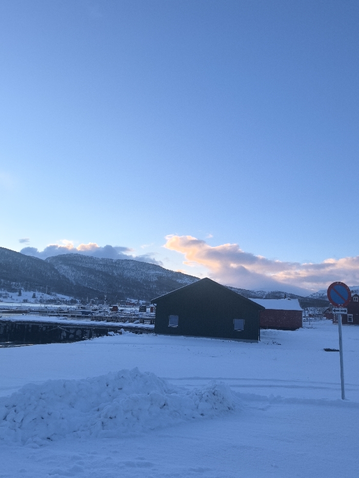 The image displays a winter landscape in the city of Gibostad, Norway. The foreground consists of a vast expanse of snow-covered ground, featuring a large, irregular pile of disturbed snow on the left. To the right, a circular traffic sign, indicating 'No Stopping' (blue disk with a red border and diagonal line), is mounted on a grey pole, emerging from the snow. In the midground, a dark green, single-story building with a gable roof and two small rectangular windows on its visible side stands prominently. Behind it, slightly to the right, a smaller red building with a similar gable roof is visible. A body of water, likely a fjord, with visible pier structures and several moored boats, separates these buildings from the distant townscape. The background features snow-covered mountains rising steeply. The mountain peaks are partially obscured by clouds, some of which exhibit a warm, golden-pink illumination, contrasting with the otherwise clear blue sky. No individuals are visible, and no discernible actions or interactions are occurring. The scene is static, illuminated by ambient daylight, possibly early morning or late afternoon.