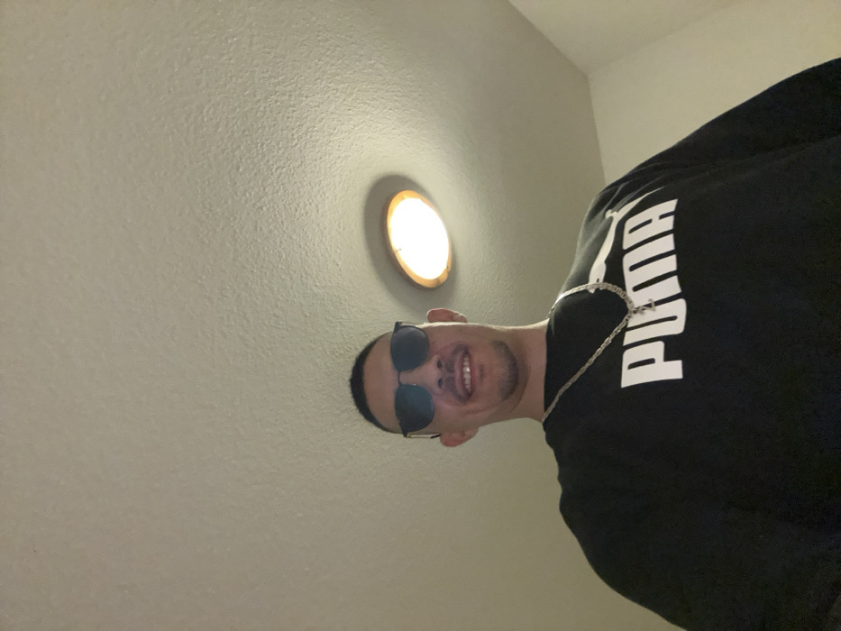 A man wearing sunglasses and a black Puma sweatshirt looks down at the camera. He has short dark hair and a silver chain around his neck. A round light fixture is on the wall behind him. The background is an off-white wall. The image is rotated.