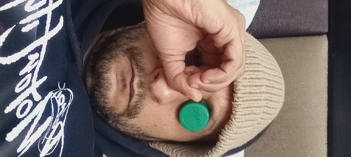 A person lies on their side, eyes closed, wearing a beige knit cap. A green plastic bottle cap rests on their cheek, held in place by a finger. The person is wearing a dark hoodie with white designs. The background features a multi-toned brown and beige couch with a dark accent.