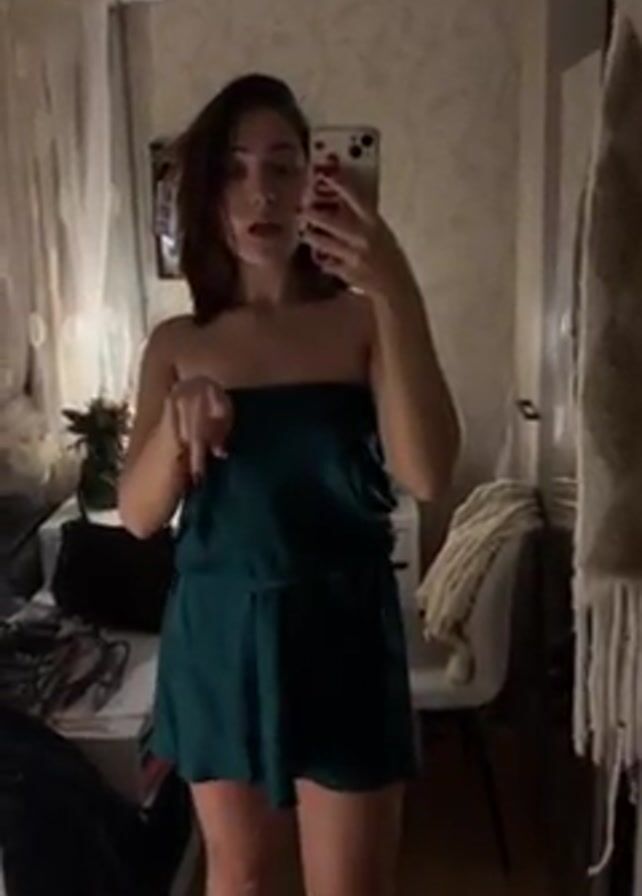 A woman with short, brown hair takes a selfie in a mirror while wearing a strapless, dark green romper. She is standing in a room with patterned wallpaper, a desk with clutter, and a white chair draped with a white throw. The music playing is uptempo. She touches her shoulder and neck while looking at herself in the mirror.